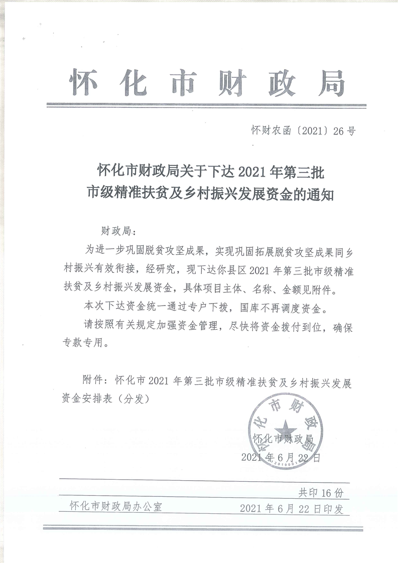 【资金分配】怀化市财政局关于下达2021年第三批市级精准扶贫及乡村振兴发展资金的通知(怀财农函【2021】26号)