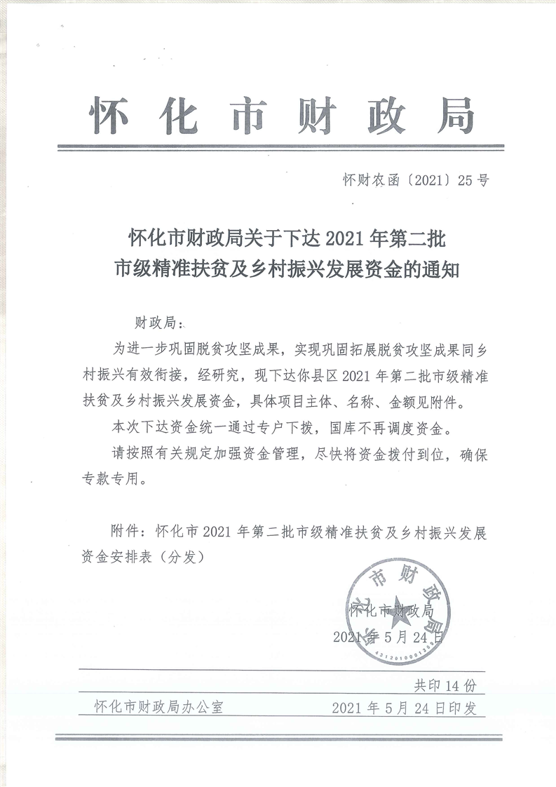 【资金分配】怀化市财政局关于下达2021年第二批市级精准扶贫及乡村振兴发展资金的通知(怀财农函【2021】25号)