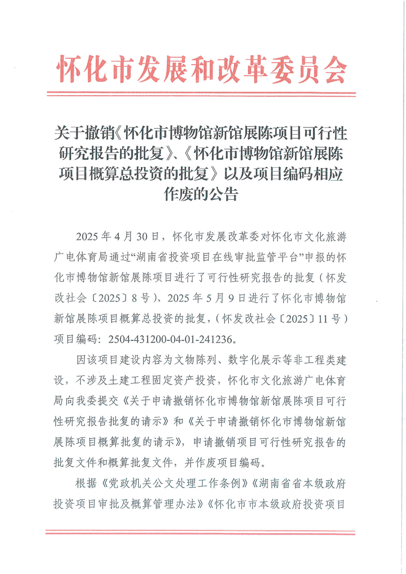 关于撤销《怀化市博物馆新馆展陈项目可行性研究报告的批复》、《怀化市博物馆新馆展陈项目概算总投资的批复》以及项目编码相应作废的公告