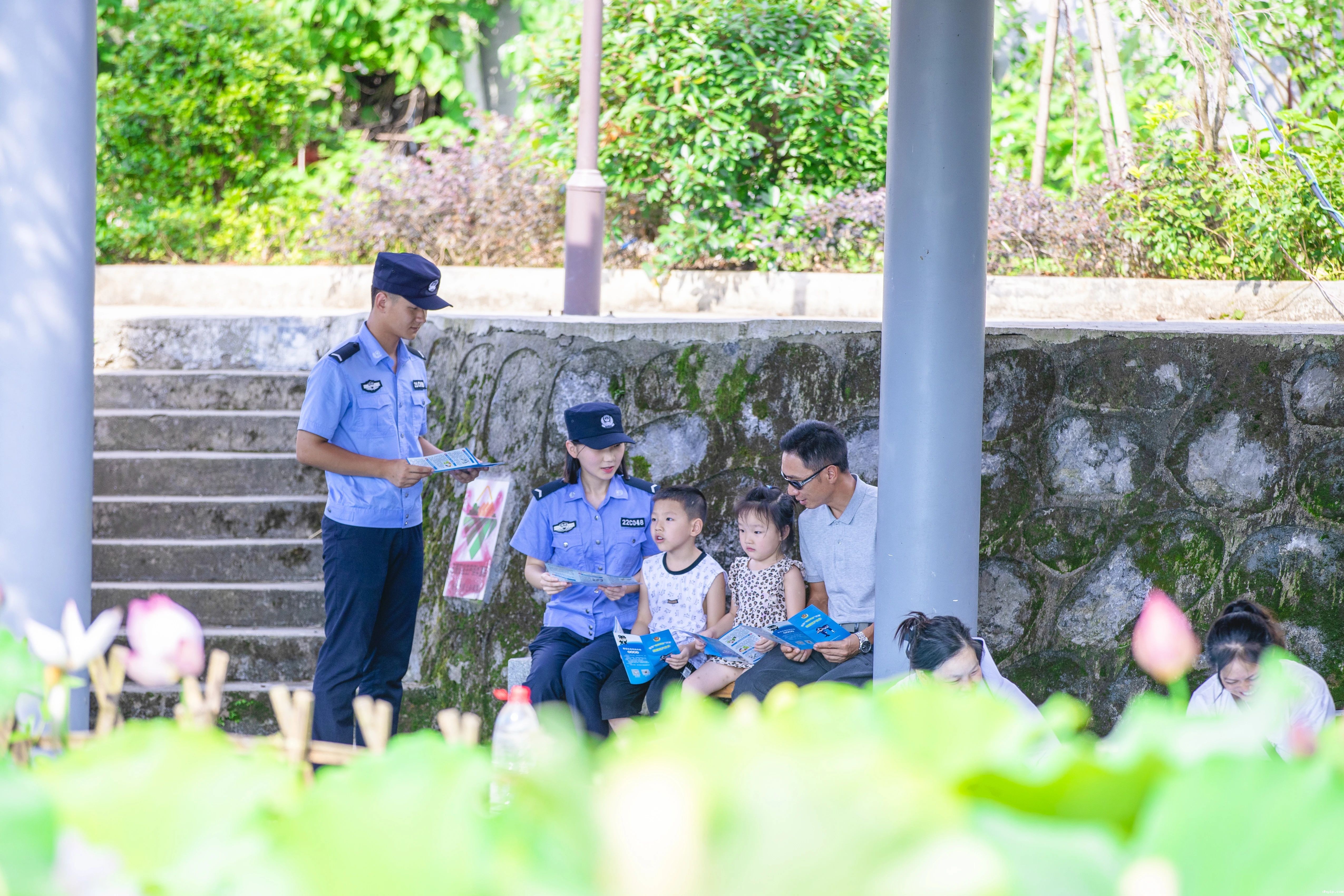 “学习反诈知识,不吃亏不上当!”“送您一本小册子,多看两眼不被骗。”活动现场,民辅警通过发手册、说案例、讲故事等方式,向游客讲解反诈知识。随着清风拂过,伴随荷花清香,也将反诈知识送到了游客心坎。