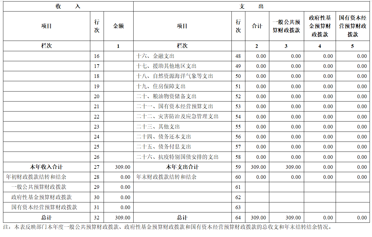2022年度收、支总计均为309万元。与上年相比,减少8.36万元,减少2.63%,主要是因为一般公共服务支出减少。