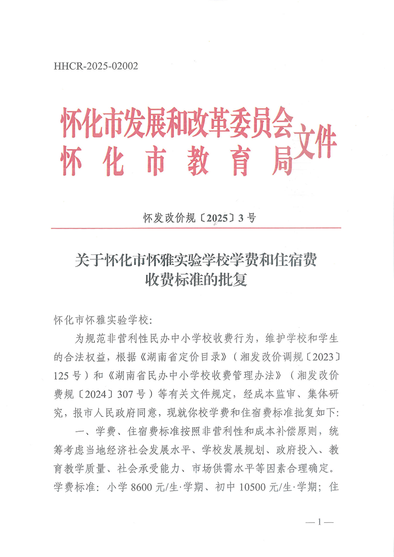 关于怀化市怀雅实验学校学费和住宿费收费标准的批复