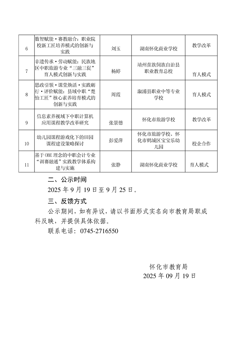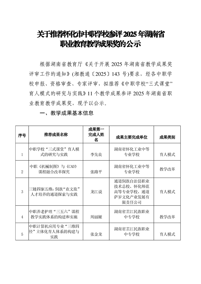 关于推荐怀化市中职学校参评2025年湖南省职业教育教学成果奖的公示