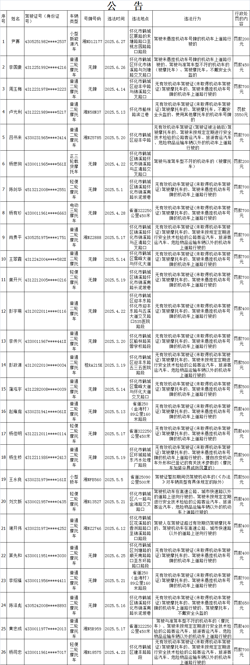 下列道路交通违法行为人(附名单以及交通违法的事实、法律依据、处罚种类、罚款金额等相关内容),因涉嫌实施了附后所列举的道路交通安全违法行为,根据《中华人民共和国道路交通安全法》等法律法规,拟应依法给予相应的行政处罚。因道路交通违法行为人无正当理由未在法定期限内来我大队接受处理,且经我队采取电话、邮寄、公告等方式依法告知,在告知期满后三十日内仍未来我队接受处理。现依据《湖南省实施<中华人民共和国道路交通安全法>办法》第46条第2款的规定,我队依法予以公告,公告期为七日。请以下道路交通违法行为人在公告期内及时来我大队(地址:怀化市鹤城区迎丰中路太平桥)接受处理,如有异议有权提出陈述和申辩,处吊销机动车驾驶证或者单笔罚款金额超过二千元的处罚还可申请听证。逾期,我队将依法作出行政处罚决定。