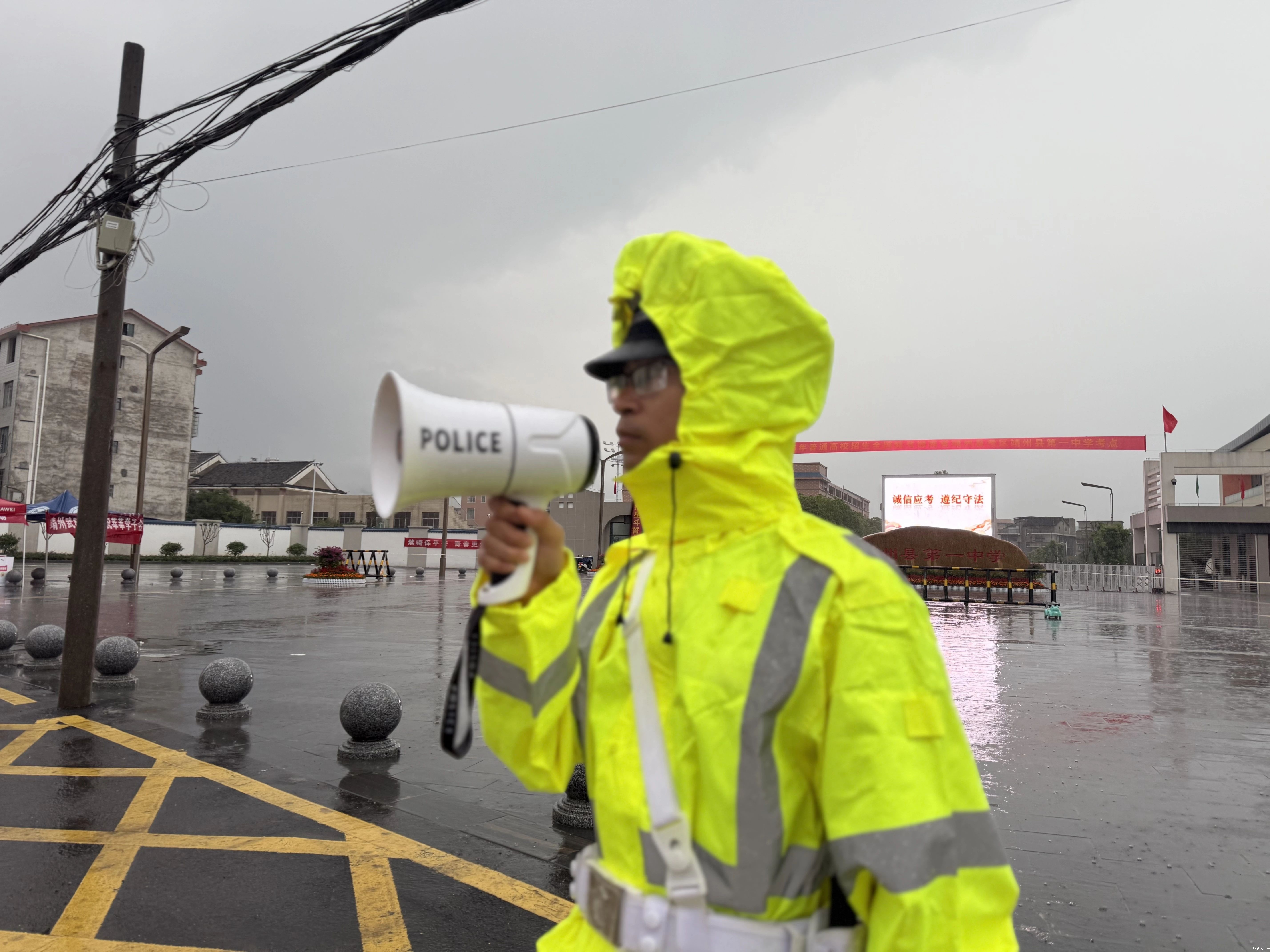 2025年高考期间,我市普降暴雨,这给广大考生带来交通不便,为确保考生顺利参加考试,怀化公安交警参战民辅警雨中坚守工作岗位,全力以赴为考生保驾护航。