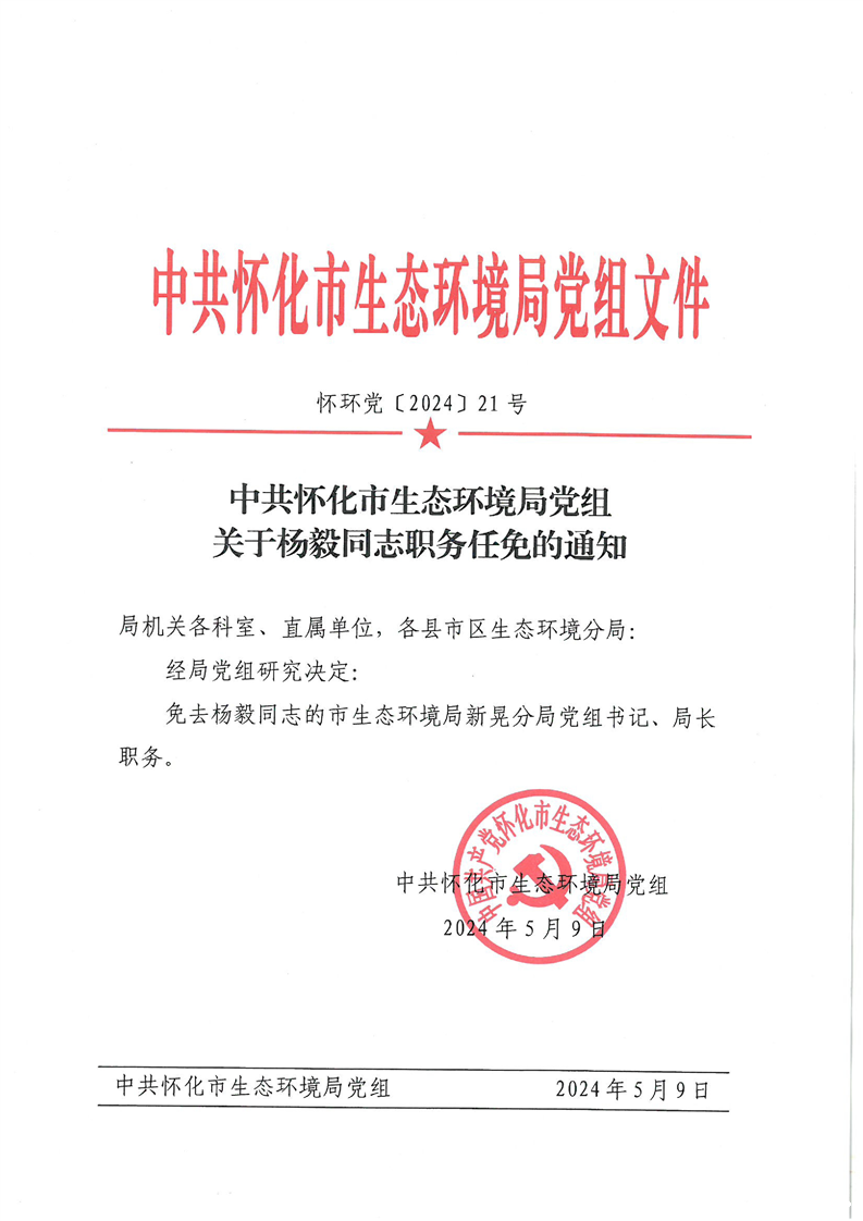 关于杨毅同志职务任免的通知(怀环党〔2024〕21号)