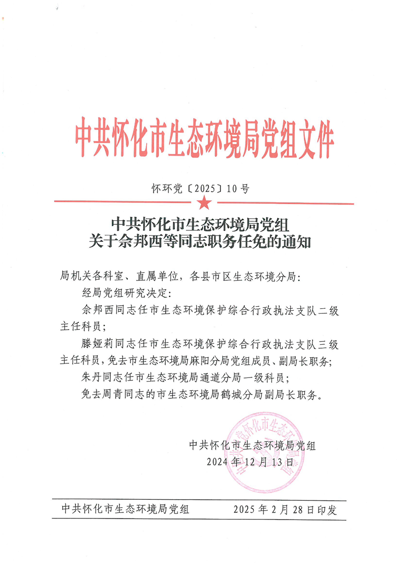 关于佘邦西等同志职务任免的通知(怀环党〔2025〕10号)