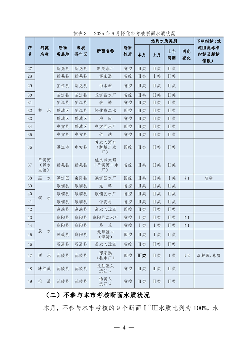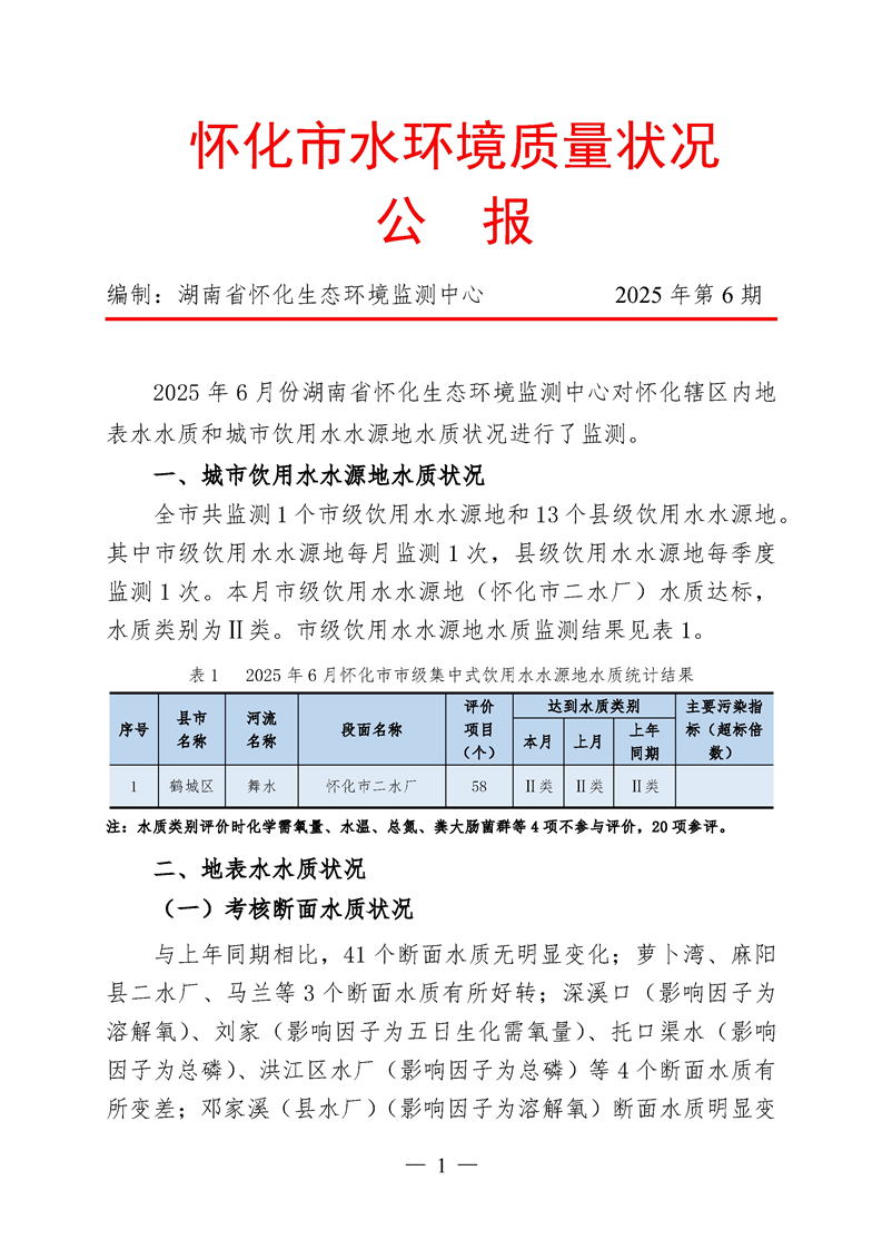 2025年6月怀化市水环境质量公报