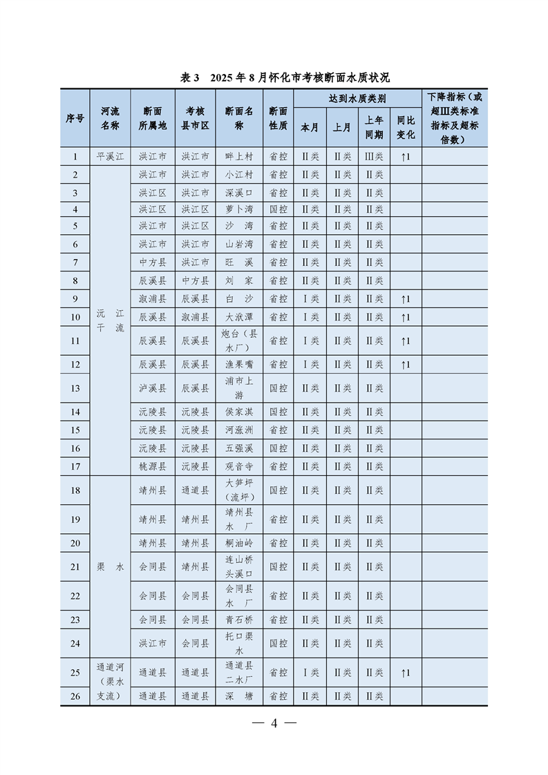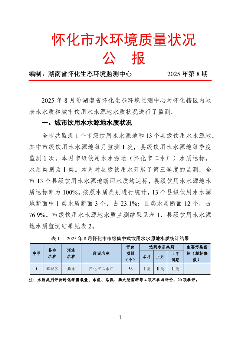 2025年8月怀化市水环境质量公报