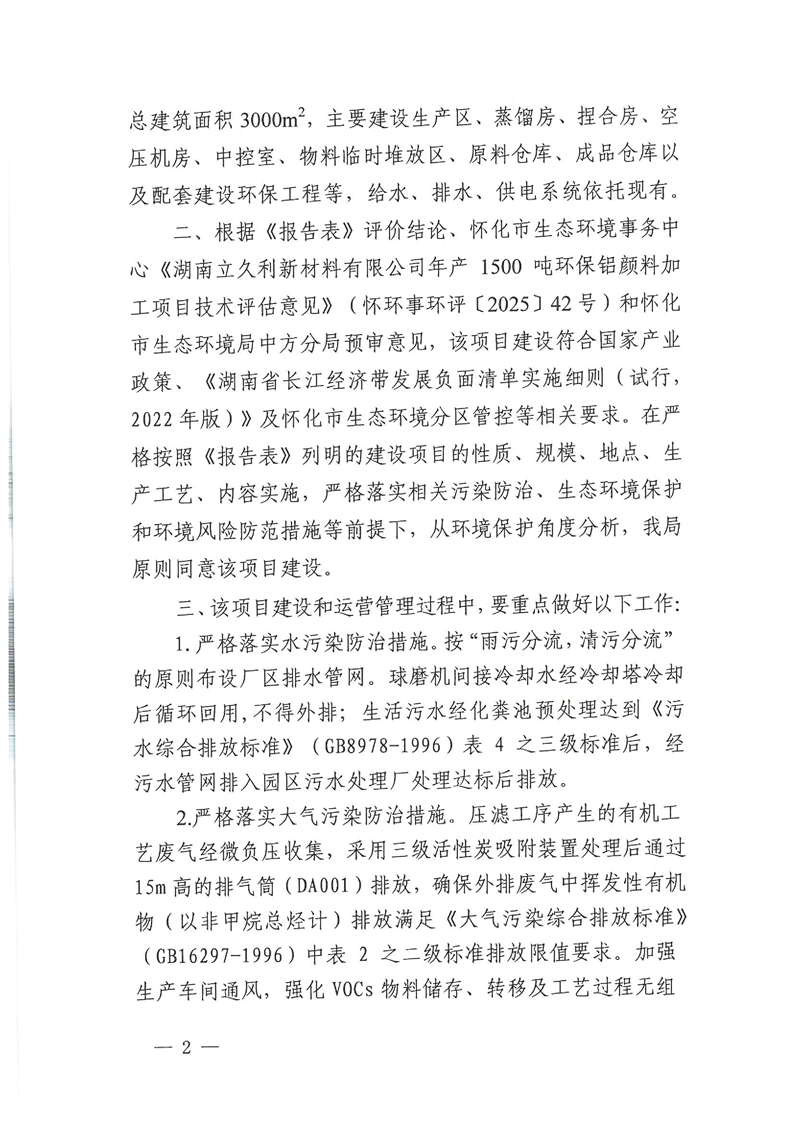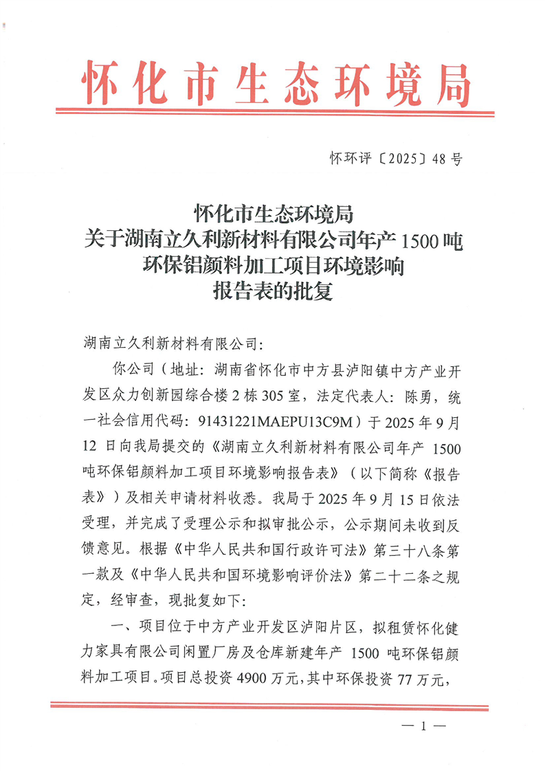 关于湖南立久利新材料有限公司年产1500吨环保铝颜料加工项目环境影响报告表批复