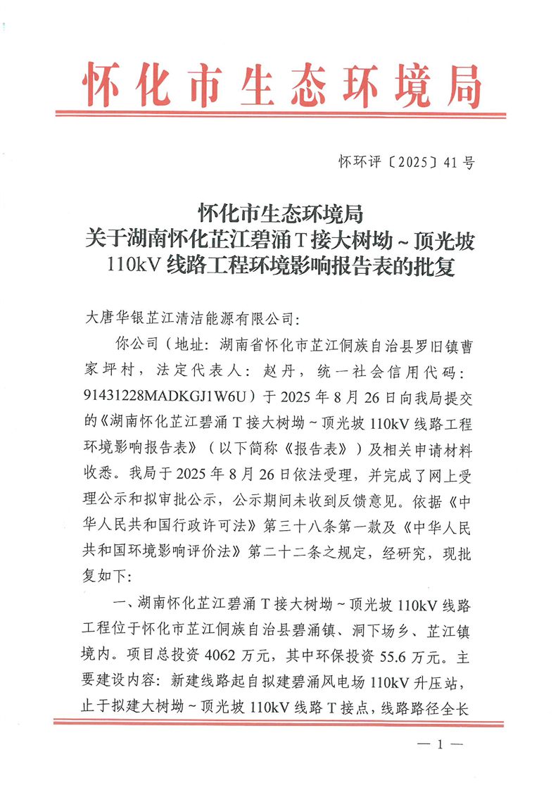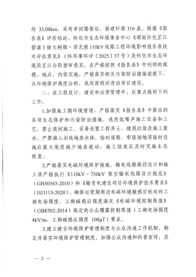 关于湖南怀化芷江碧涌T接大树坳~顶光坡110kV线路工程环境影响报告表的批复