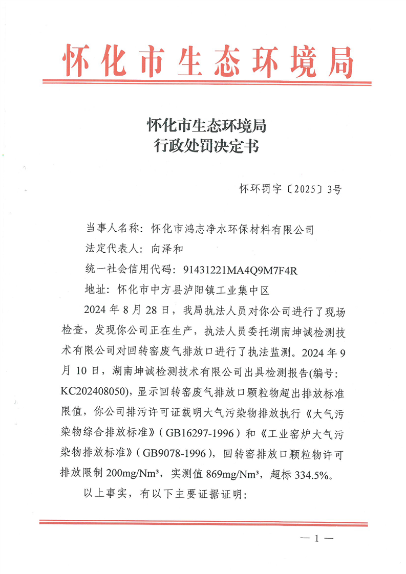 怀环罚字〔2025〕3号(怀化市鸿志净水环保材料有限公司)
