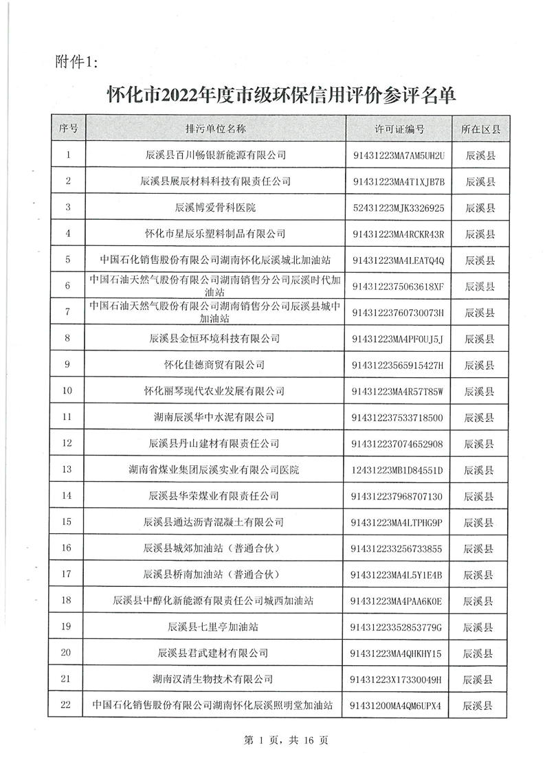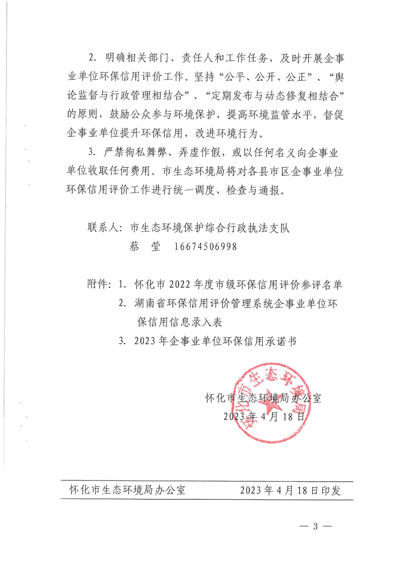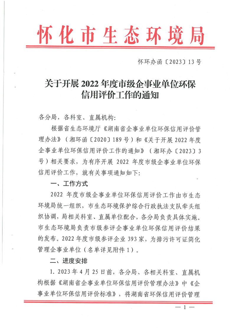 关于开展2022年度市级企事业单位环保信用评价工作的通知(怀环办函〔2023〕13号)