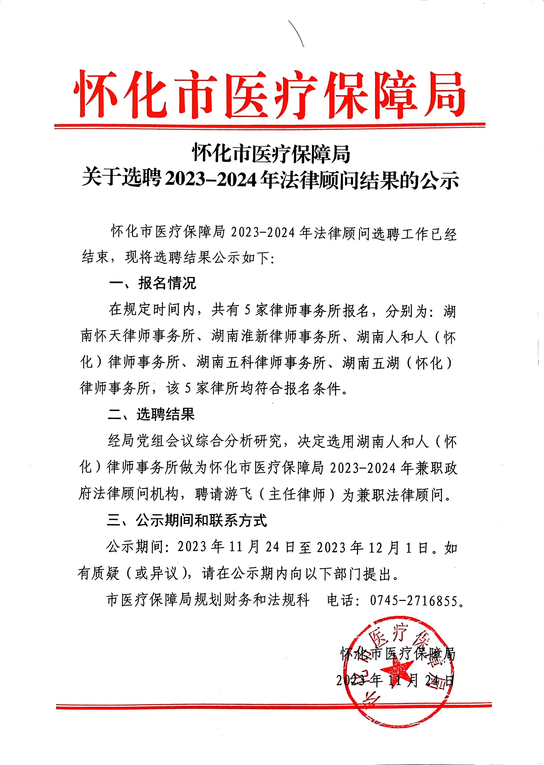 怀化市医疗保障局关于选聘2023-2024年法律顾问结果的公示
