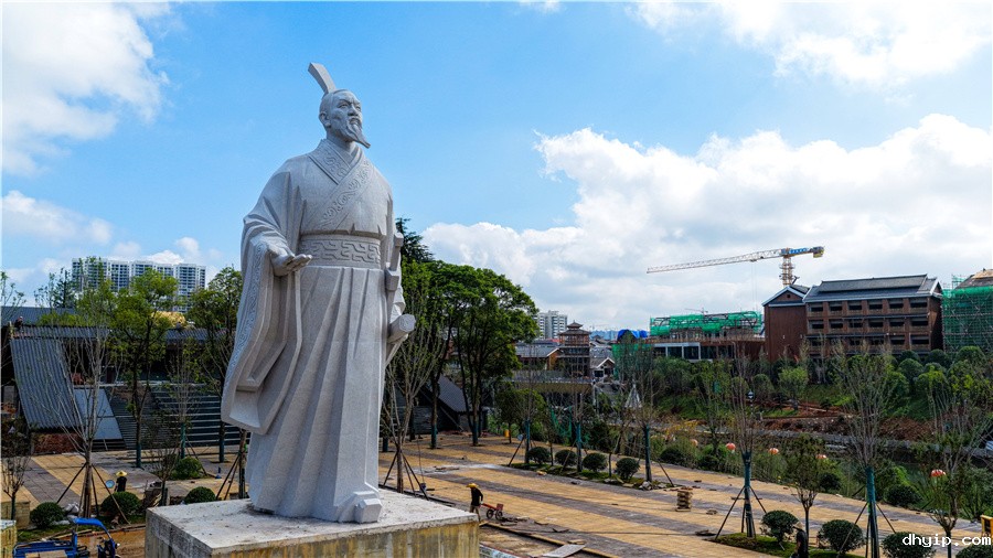 8月16日,在舞水之滨的怀化天问岛上,屈原雕像静静矗立,旁边的施工工地正忙碌施工。(怀化日报全媒体记者 潘雨 摄)